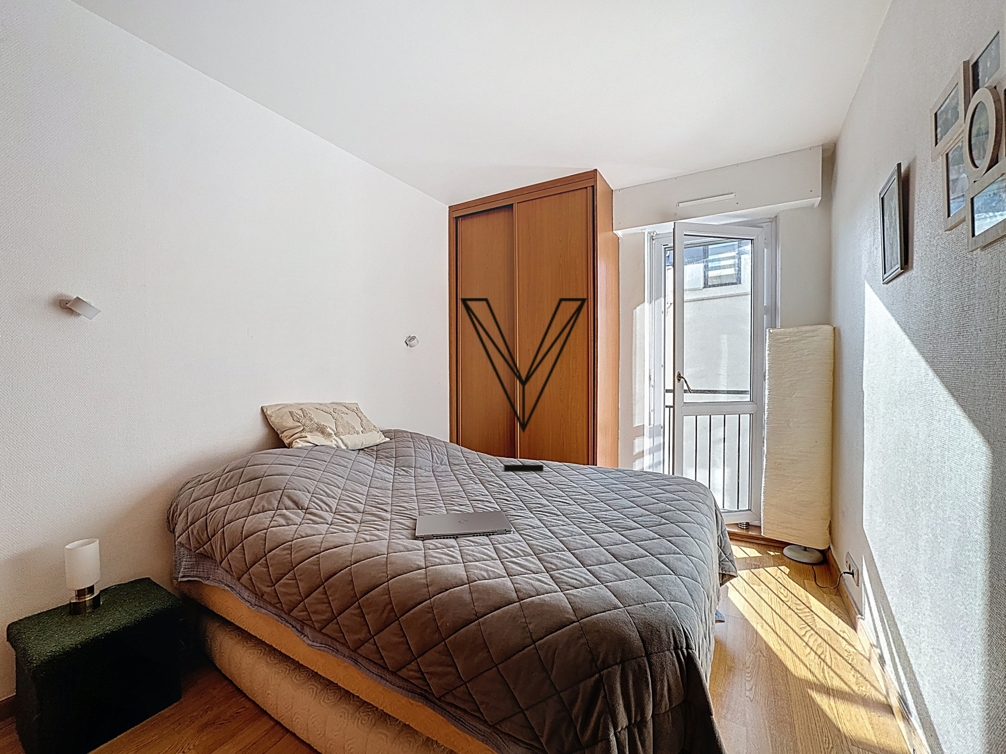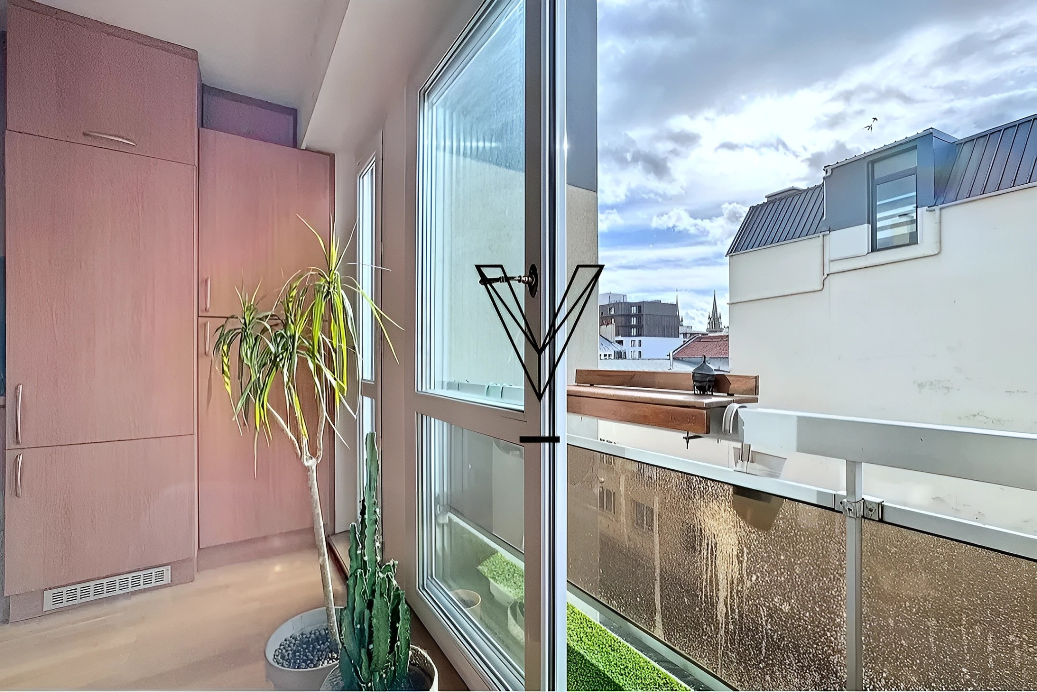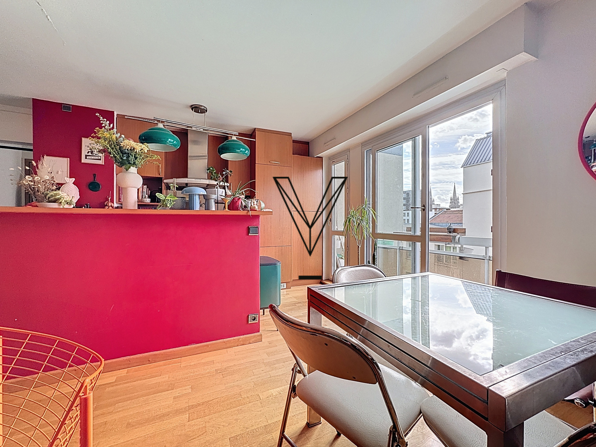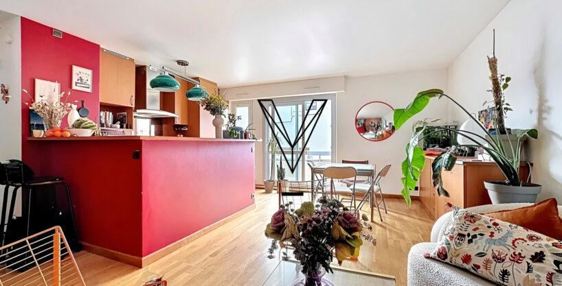 L’appartement s’ouvre sur une belle pièce de vie de 31,81 m2 avec cuisine américaine aménagée et de grandes baies vitrées donnant sur un balcon filant de 2,69 m2 offrant des vues dégagée (vue sur le clocher de l’église St-Ambroise). Un dégagement mène à la chambre avec rangements intégrés, à une salle d’eau et à des toilettes séparées.