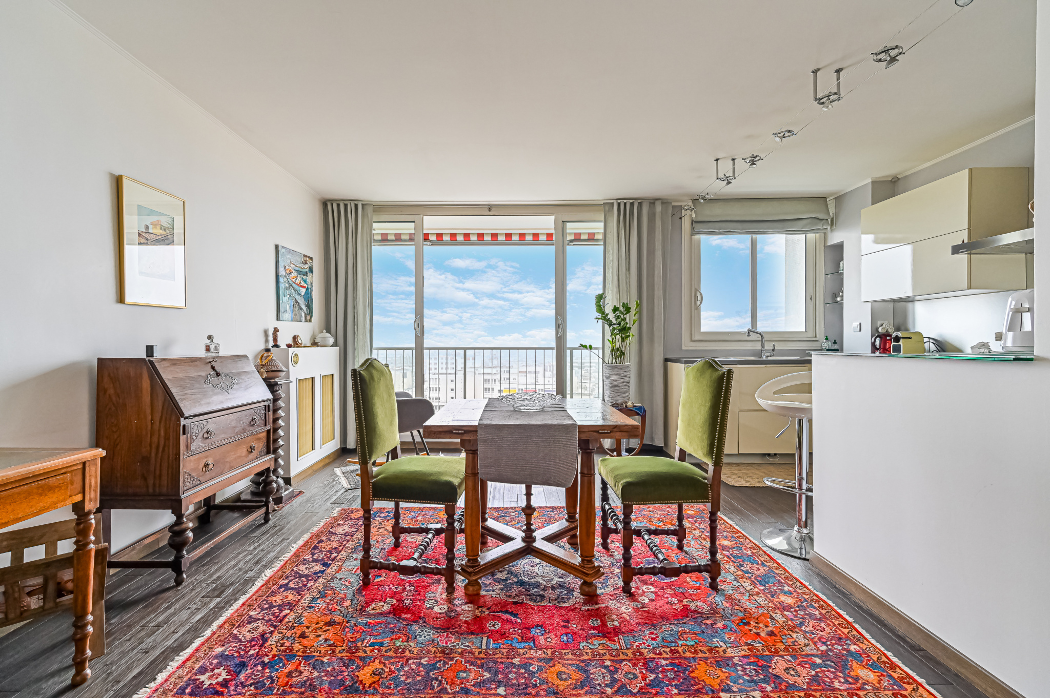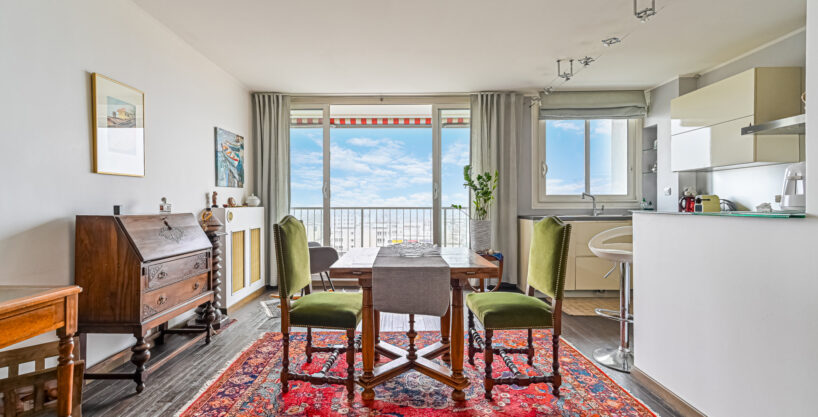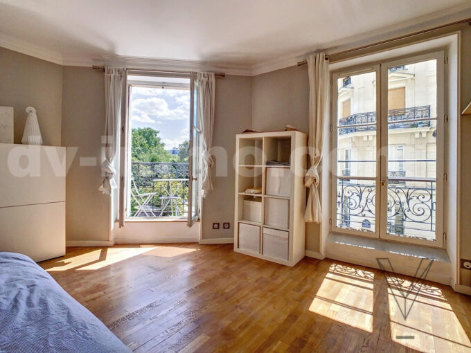 Un séjour lumineux et ensoleillé avec balcon et une vue dégagée et exceptionnelle sur les plus beaux MONUMENTS de PARIS, une confortable chambre avec balcon également , Une cuisine ouverte entièrement aménagée et équipée, une salle de bains avec wc intégrés;