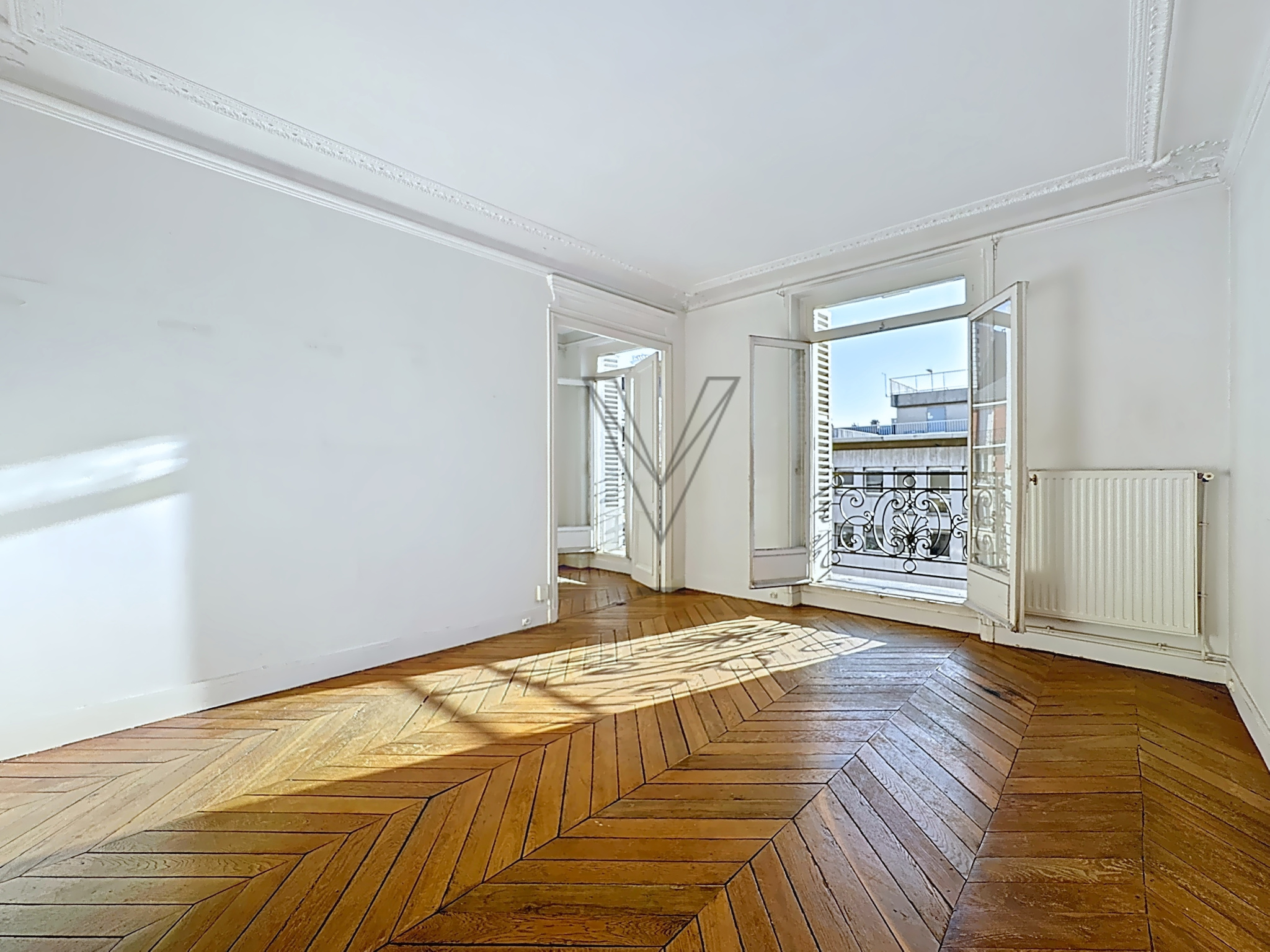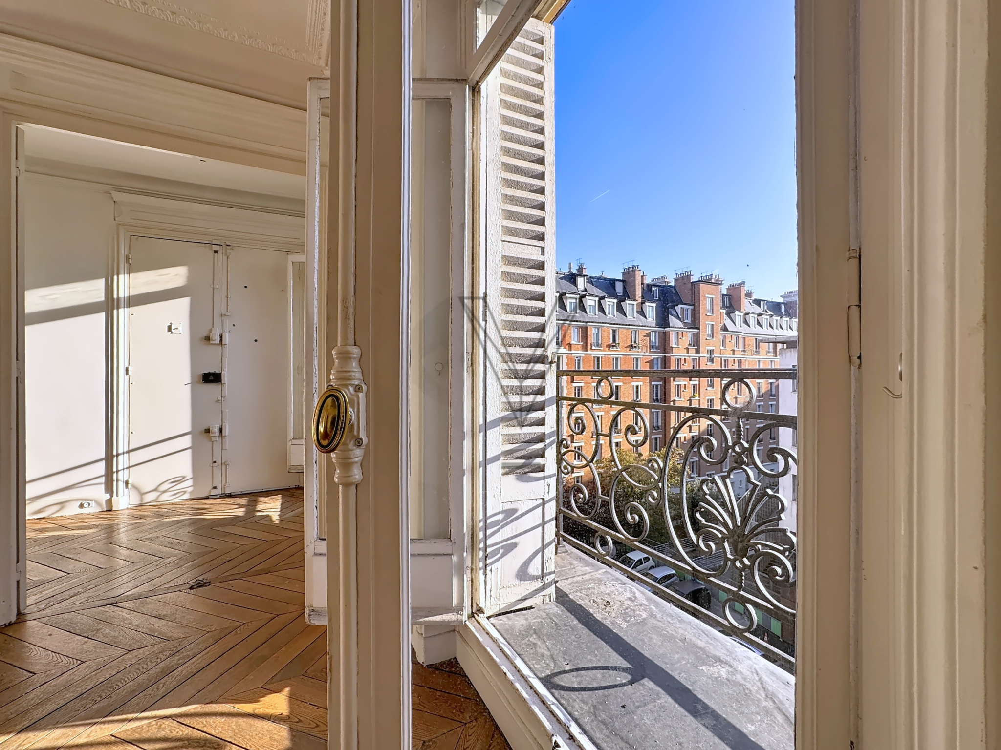 En franchissant la porte, on est immédiatement séduit par la hauteur sous plafond (2.87 m), par le parquet massif, par les moulures qui déclinent une élégance et une référence au temps. Le séjour, baigné de lumière, donne sur un balconnet — ce petit espace intime qui change tout. Trois chambres offrent une rare configuration pour un lieu aussi central.